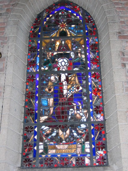 Dat gaat zoo door aan beide zijden van het raam tot bijna boven aan toe: Koeien en schapen, om ons voortdurend te herinneren, dat wij op de aarde zijn. Alleen boven aan het raam gekomen, als wij den hemel naderen, dan liggen daar de herders geknield.